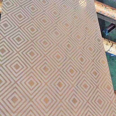 Các mẫu khắc được tạo ra bằng cách chọn lọc áp dụng một lớp phim chống axit bảo vệ vào các khu vực được chỉ định và khắc axit vào các khu vực không được bảo vệ.thay đổi màu sắc thành màu xám bạc mờ, và làm thô bề mặt, có thể tương phản với mài, siêu gương hoặc các kết thúc khác để tạo ra hàng ngàn biến thể.Nó được sử dụng rộng rãi cho các ứng dụng trang trí, chẳng hạn như cửa thang máy, tấm tường, đối phó và trang trí.