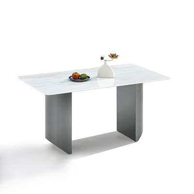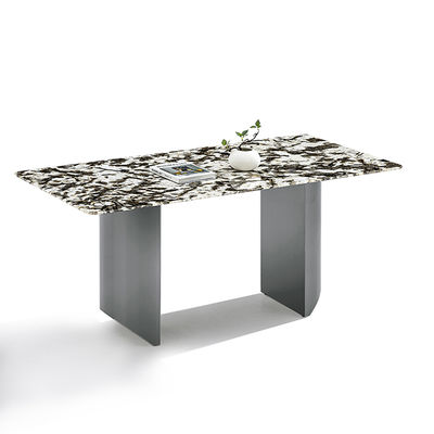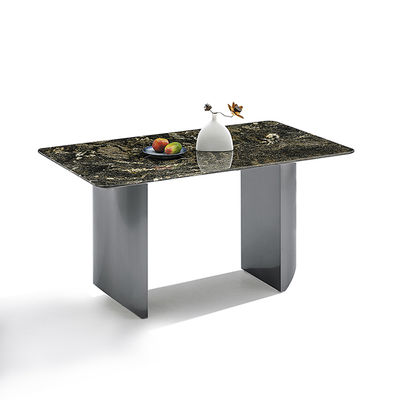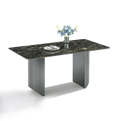 Bàn ăn mặt đá thiêu kết hiện đại, chân thép không gỉ màu đen gương